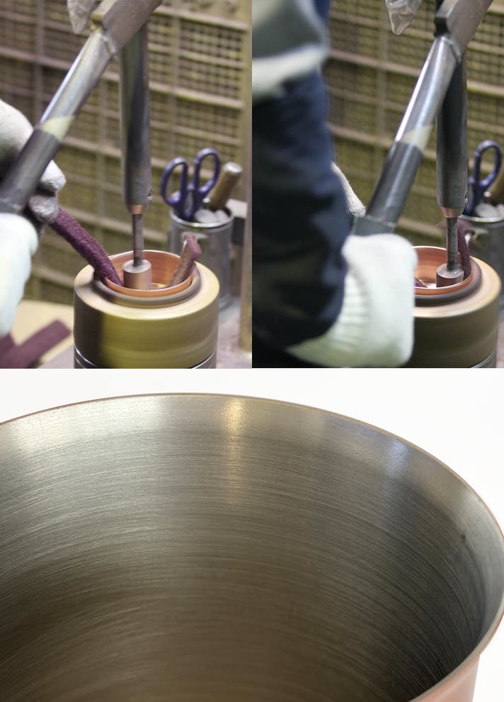 最終工程で、研磨職人が一つひとつ磨き上げます。特に銅は素材が柔らかいものになりますので、研磨する際の当て感や、力の入れ具合いなどは、長年の技術がなければ磨き上げることができません。
