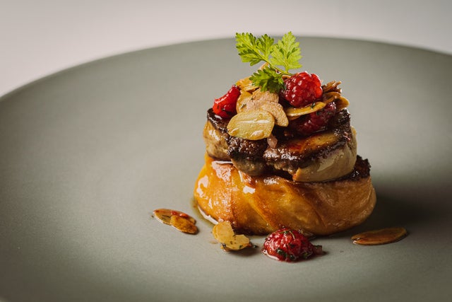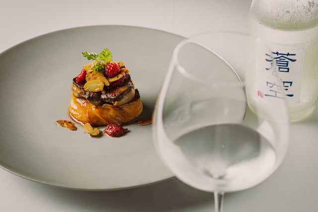 フレンチトーストにフォアグラをのせた皿には、繊細な味わいの大吟醸がよく合います。
