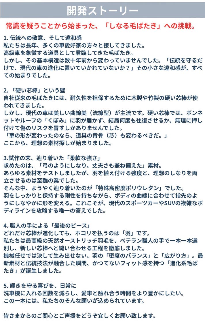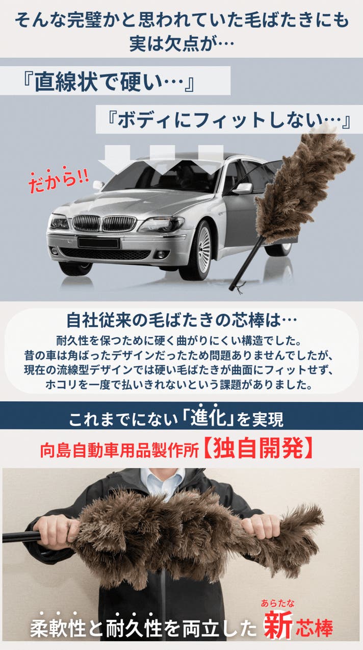 - 曲線が主流の現代車ボディにも密着する新設計「しなる毛ばたき」が誕生