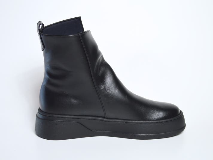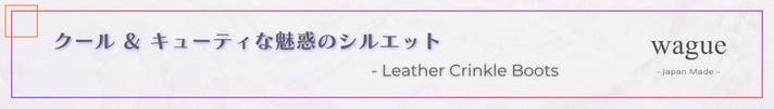 wagueを象徴するクリンクル(波状)加工。くしゃっと大振りなシワを作ることにより、足元にぽってりとしたボリューム感をもたらします。精悍なブラックレザーとキュートなシルエットの2面性がポイント。