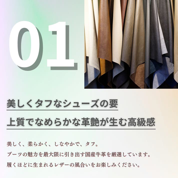 プロの職人が厳選し、こだわり抜いた高品質のステアハイド。履くほどに深まるレザーの風合いをお楽しみください。