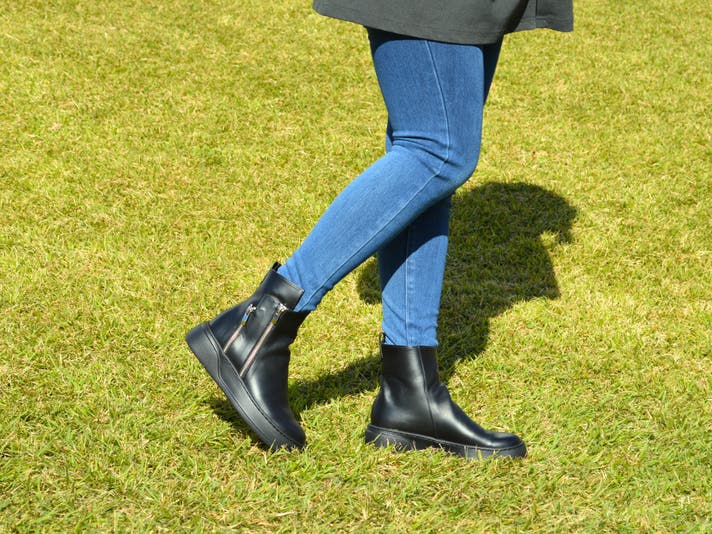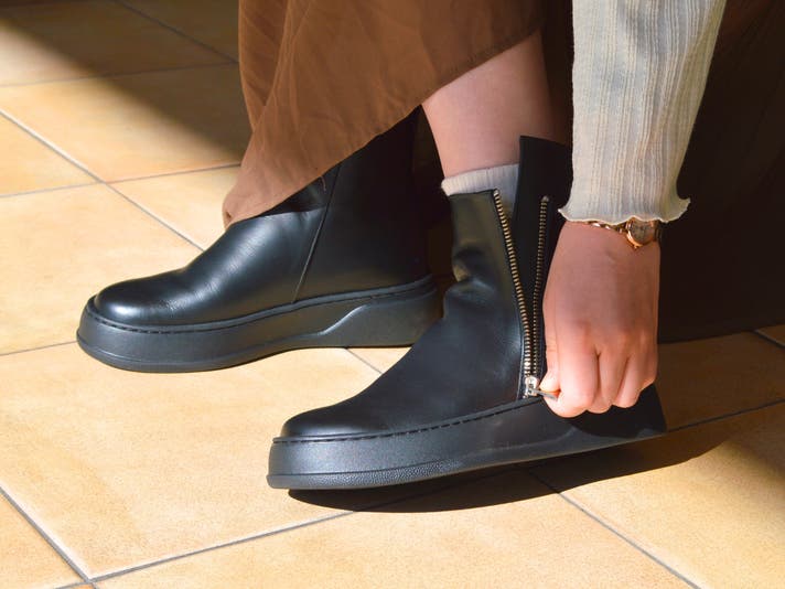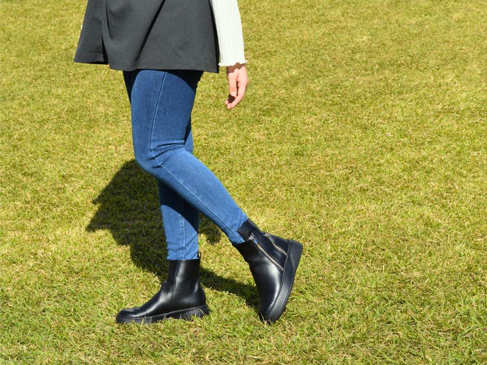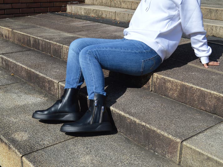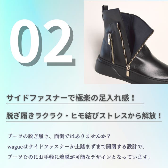 ブーツに不満を抱きやすいポイントとして、着脱時の靴ひもの締め直しが挙げられます。wagueはシューレースを省き、サイドファスナーがソールまで開くデザインなので、ノンストレスでの脱ぎ履きが可能に。足の甲を広く包み込むフィット感で、丁度いいホールド感を目指しました。