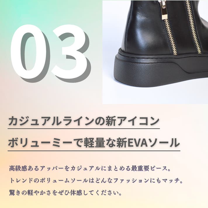 冬といえばブーツの季節。しかし、昨今はスニーカー全盛期といわれる程に、気軽でバリエーション豊かなスニーカーが流行しています。我々は高級婦人靴の象徴であるブーツを、現代の流行にマッチさせるべく徹底研究し、カジュアルシェイプとの絶妙な融合を実現しました。