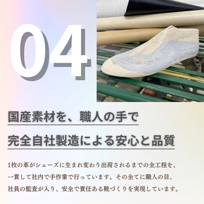 【素 材】表材:国産牛革 / 裏地:機能性ウレタン / 底材:EVA