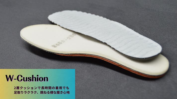 中底には低反発ウレタン素材のマザータッチを敷き、ふわふわの足当たりを実現。これらが併さることにより、革靴とは思えない跳ねる様な軽やかさをもたらします。