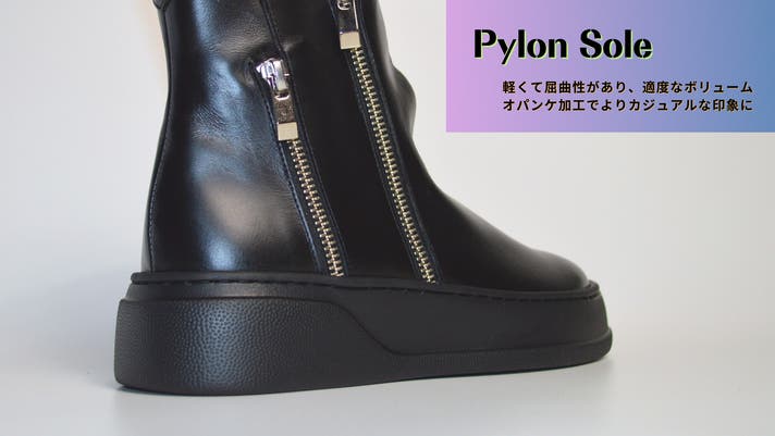 独自開発のパイロンソールは、いわゆるスニーカーソールで軽量かつ屈曲性に優れます。また、ボリュームのあるルックスに反して非常に軽量設計なアウトソールとなっています。