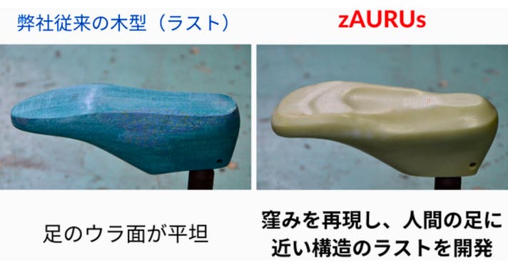しかし、zAURUsの特性に合わせてより人間の足の構造に近い木型を開発。右の写真の様に、足裏の自然なアーチがスムーズな歩行をサポートします。