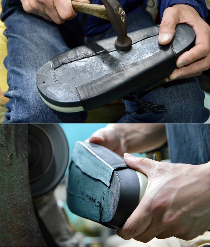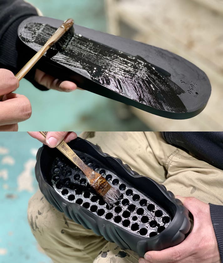 また、EVA同士は密着しにくい性質を持つため、専用の下処理剤を塗布することで接着性をアップ。もちろん手作業により丁寧に製造し、より堅牢に進化したソールは、愛用者のお悩みを全て解決します。