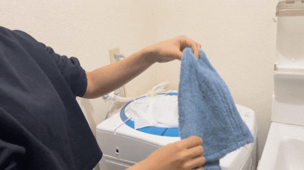 干す前にタオルの両端を持って、勢いよく上下にタオルを振りましょう。タオルを振ると繊維に空気が入り、パイルが立ってふわふわになります。