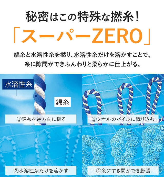 何と化粧品の展示会で浅野撚糸の「スーパーZERO」と出会ったのです。浅野撚糸さん曰く、「本来のスキンケア、ヘアケアと合わせてスーパーZEROのタオルを使うことで相乗効果が得られる。スーパーZEROも含めて化粧品という位置づけで」出展されていたそうです。
