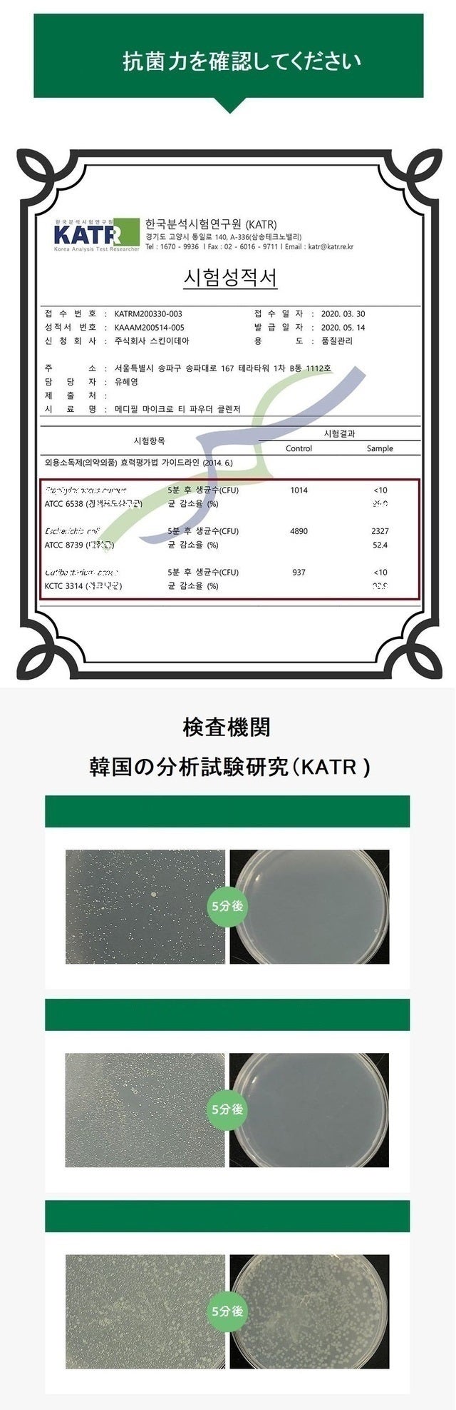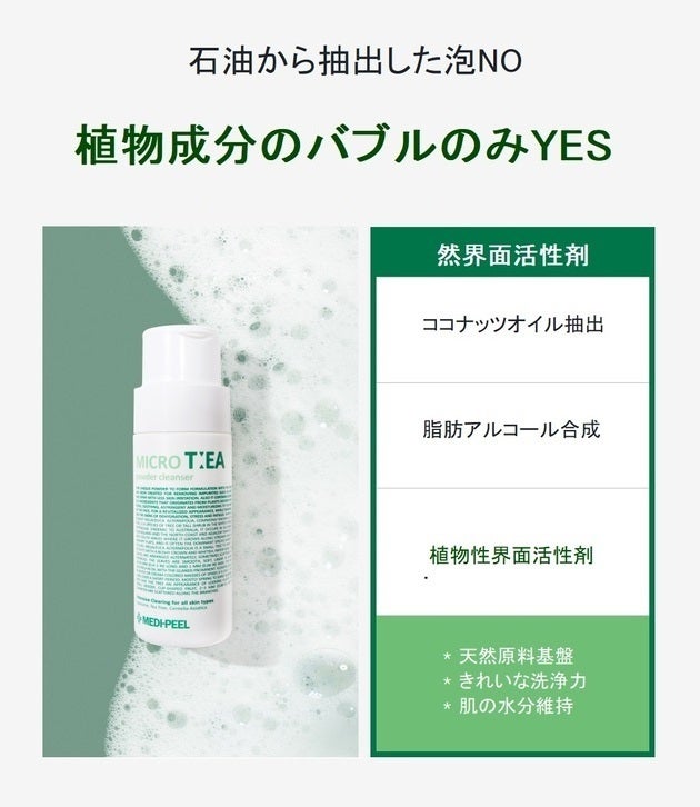 白いティーツリーパウダーが緑のマイクロバブルで毛穴をケアします。*マイクロティーパウダークレンザは韓国の皮膚科学研究所である(corederm)よりテストを受けました。