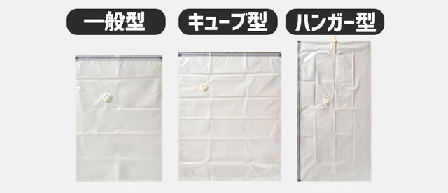 1) 真空圧縮袋 一般型 1個 + 3Dキューブ型 1個 + ハンガー型 1個