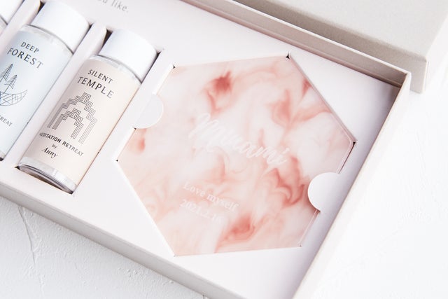 ご用意したのはリトリート(日常から離れたリフレッシュした旅行)気分を味わえる5種類のバスソルトと名入れコースターのギフトセット。