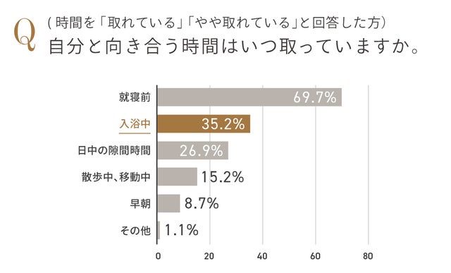 「就寝前」に時間を取る方が約70%と最も多く、続いて「入浴中」が2位に。やはり1人になれる時間は貴重ですね。