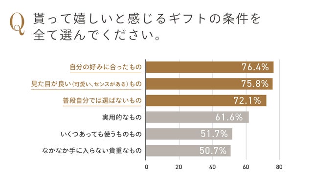条件は「普段自分では選ばないもの」が3位に。ギフトには自分では出会えない楽しさや体験を求めているのかもしれません。