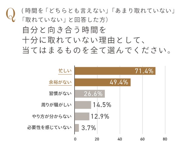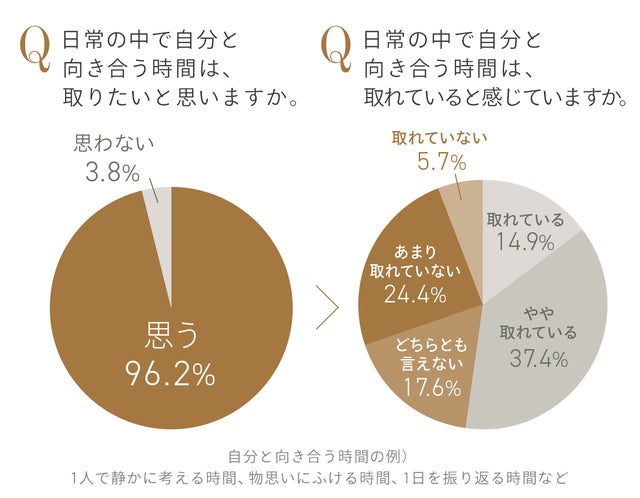 多くの女性が、「自分と向き合う時間を取りたい」と思っているにも関わらず、約半数の方が時間を取れていないのが実態です。