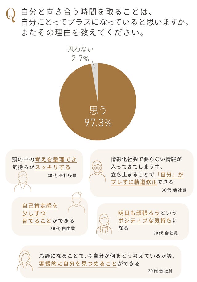 「自分と向き合う時間」を取ることで自分にプラスになっているという声が97.3%。