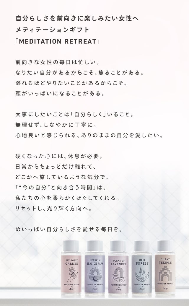 そこで、この度Annyでは、メディテーションギフト『MEDITATION RETREAT』をオリジナル開発をしました。「“今の自分”に向き合う時間」を大切な人に贈るもよし、自分へのご褒美として取り入れるのもよし。