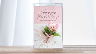 ドライフラワーの可愛いミニブーケがついたグリーティングカードです。クリアケースに入れてお届けいたします。