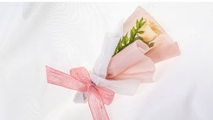 プリザーブドフラワーを使ったバラの一輪花です。窓付きの手提げ袋をお付けします。