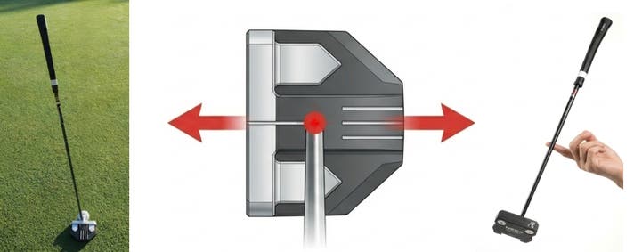 机にパターを置いた時、シャフトの延長線上に重心があるため、重力でトウが上を向いて安定します。トルクがほぼないためフェースのなじれが少なく、ストローク時にもフェースがターゲット方向にスクエアに入りやすい設計。