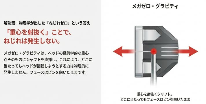 ストロークの革命: 重心角ゼロ設計により、スイング中のフェース開閉が起きません。手先で調整する必要がなく、ただ「引いて出す」だけでオートマチックに真っ直ぐ転がります。