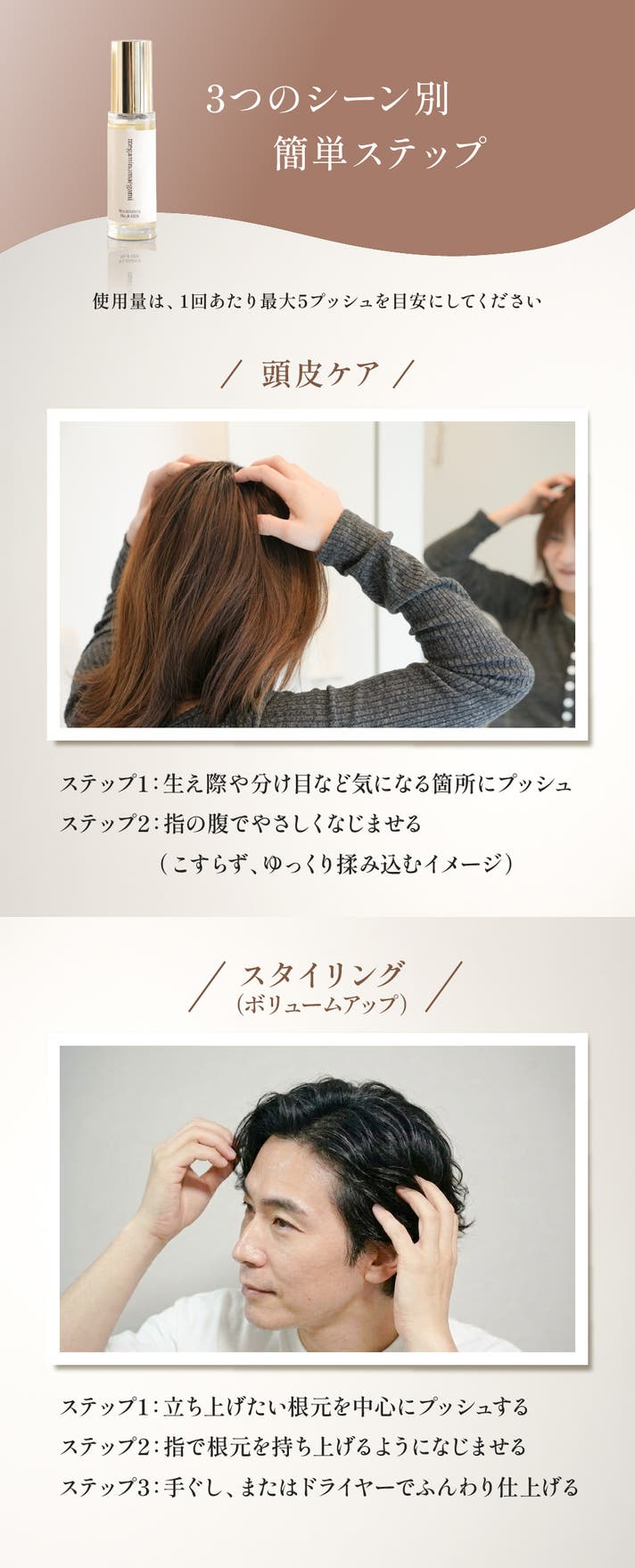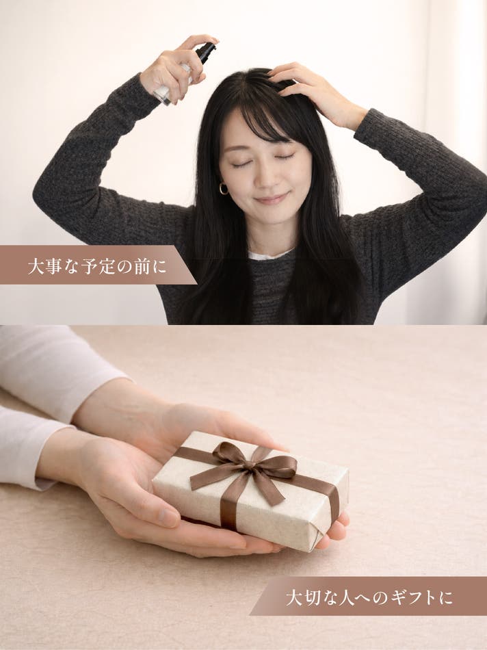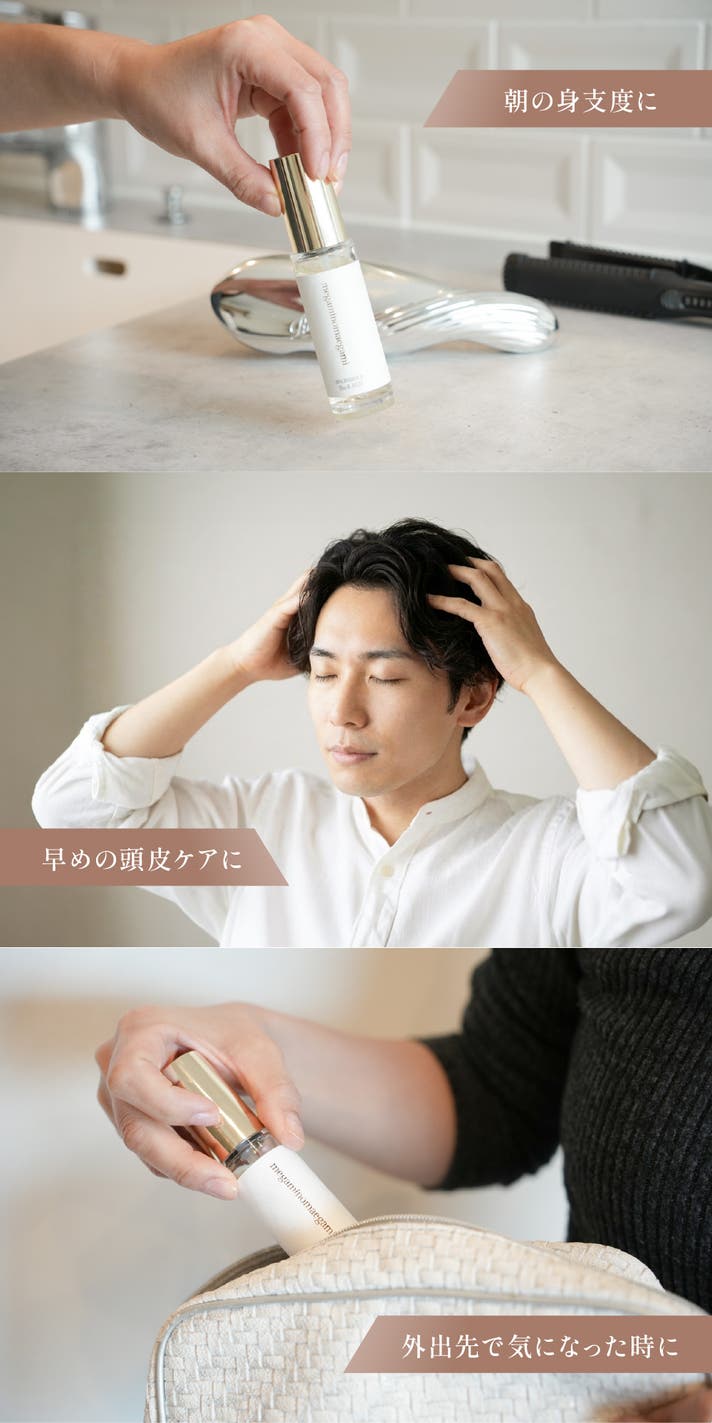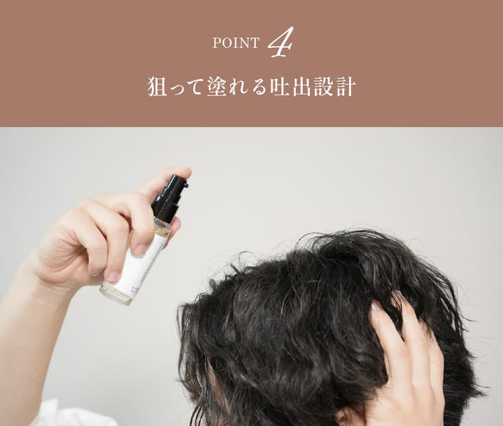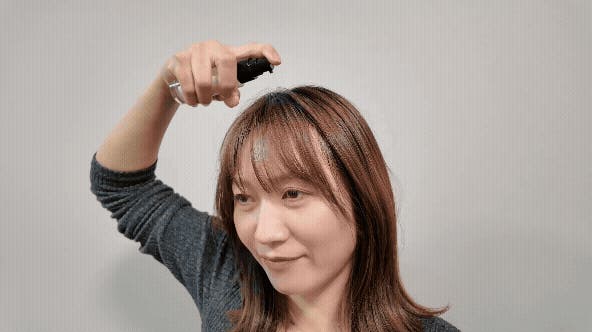 A. 生え際や分け目など、気になるポイントにお使いください。頭皮に届くようにプッシュし、指の腹でやさしくなじませてください。詳しくは上記の「3つのシーン別の簡単ステップ」をご参照ください。