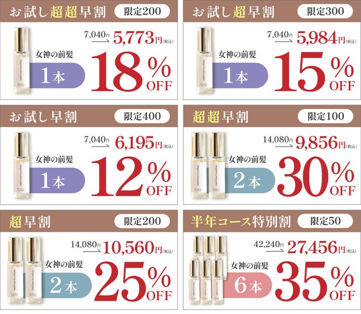 【内容】女神の前髪 × 6本(1本で約1ヶ月使用可能× 6本)の特別セットです。
