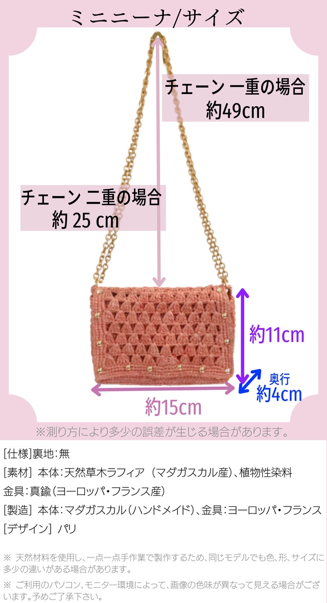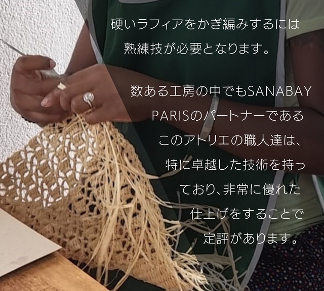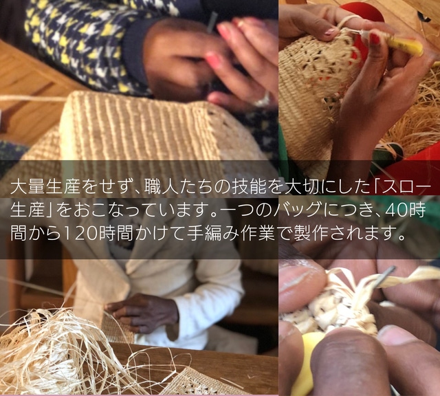 ※ 本製品は一点ずつ職人によって手作りされるため、見本とは色合い・テイスト・形等に微妙な違いがでる場合もあります。一点ものとしてご考慮ください。また天然素材のラフィアの性質上、ラフィア繊維のつなぎ目が時々現れる場合もございます。