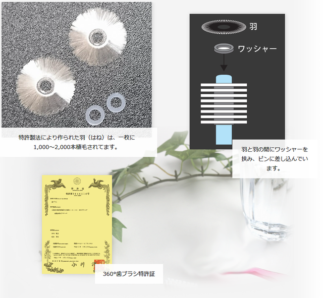 世界初、超音波技術を応用した360°歯ブラシ。毛数は2万本以上の高密度毛。1本の毛は、超極細0.07~0.09㎜。環状型ブラシ毛とワッシャー(隙間)とを重ね合わせ、それぞれ独立した8段のブラシ束が優れた清掃効果を実現(特許製法)。効果は医療機関検証済。効果・効能も歯科学会で発表、多くの歯科医も推薦しています。