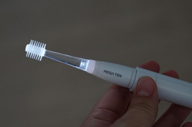 メガテンは2万本以上の毛を360°円形に取り付け、歯と歯茎をやさしくきれいに磨ける、ビバテック社製造のブラシヘッドを採用した新しいタイプの電動歯ブラシです。