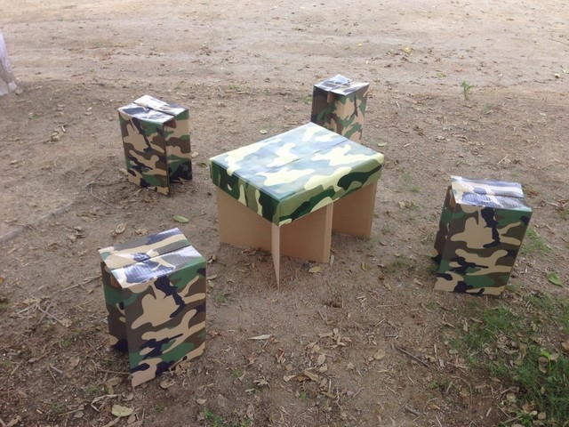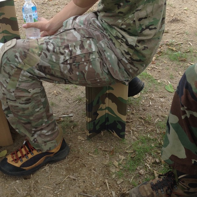 ▼当社で販売している、コート段ボール製の迷彩柄いす「ミリイス」