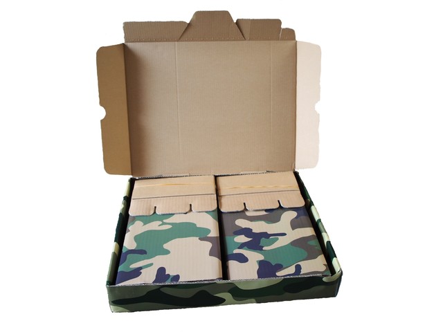 迷彩柄は同じ面積の3枚の印判が必要になり非常に印判代が高くなります。ですから、中々迷彩柄の段ボールの商品はないのです。