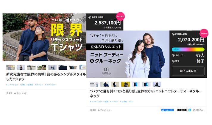 第1弾の『限界リラックスフィットTシャツ』では142名のサポーターの方々から258万円以上、第2弾の『ニット フーディー&クルーネック』では69名のサポーターの方々から207万円以上の応援を頂きました。