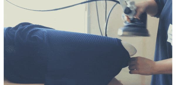 最後の仕上げはプレス職人による手作業の「立体プレス」。熱と圧力で形を整える作業ですが、大変手間か掛かるため通常のニット製品では10秒程度しか行いません。