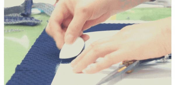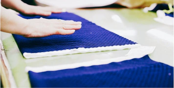 編み立てで仕上がった生地を型紙に合わせ裁断する作業です。