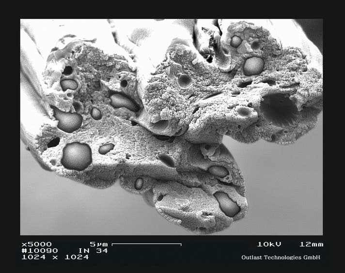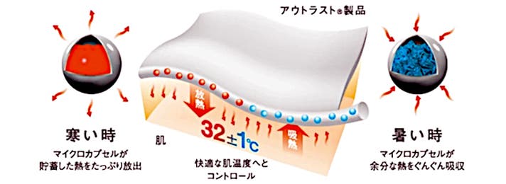 Outlast®はこれを利用し、暑い時には体温をどんどん吸収して冷し、逆に寒い時はため込んだ熱エネルギーを放出して体を温め、生地の表面温度が常にヒトにとって最も心地よい温度にキープされるように調整されます。
