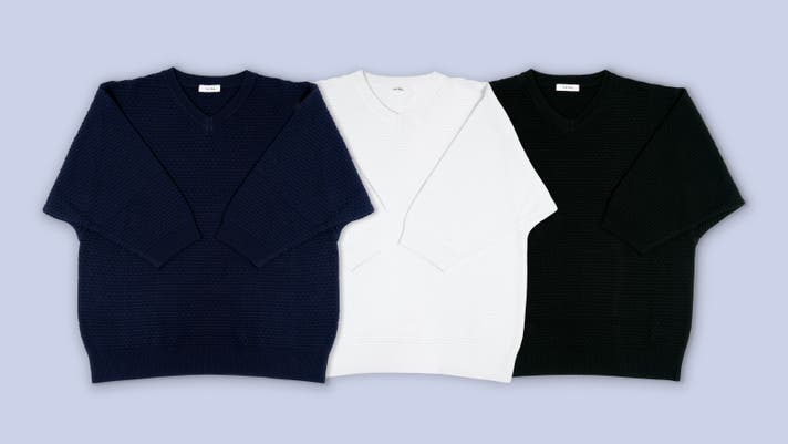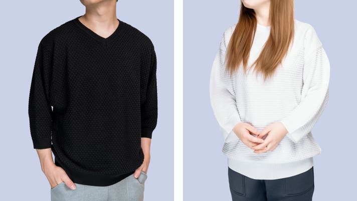 ニット専業で培った蒸し暑い日本の夏でもサラっと着られる通気性の高い編み立てと、着衣で快適な体感温度をキープするサーモテクノロジー素材Outlast®を採用し、日本製のニットウェアだからこそ体験できる上質の着心地の良さを追求。