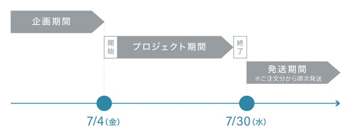 ※ご使用後の着用感等を理由とした返品・返金はお受けいたしかねます。 ※本文中に記載させていただいたスケジュールは、あくまでプロジェクト公開時点の予定です。応援購入の性質上、配送遅延のおそれがございます。 ※原則として、配送遅延に伴う応援購入のキャンセルはできませんが、リターン配送予定月から3ヶ月を超えた場合には、希望者に限りキャンセルにて対応させていただきます。 ※本プロジェクトの実施において十分確認は行なっておりますが、開発中の工程において、デザイン・カラー・仕様が一部変更になる可能性もございます。 ※製造スケジュールについて、プロジェクト成功を想定した数量で調整しております。しかし、想定を上回る応援購入の申し込みがあった場合、製造工程上の都合や配送状況に伴うやむを得ない事情で、お届けが遅れる場合がございます。 ※プロジェクトページに記載している内容に変更がある場合には、できる限りレポートなどで迅速に共有をおこないます。 応援購入サービスの性質上、以上の注意点についてあらかじめご理解とご了承いただいた上で応援購入くださいますよう、よろしくお願い申し上げます。