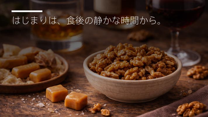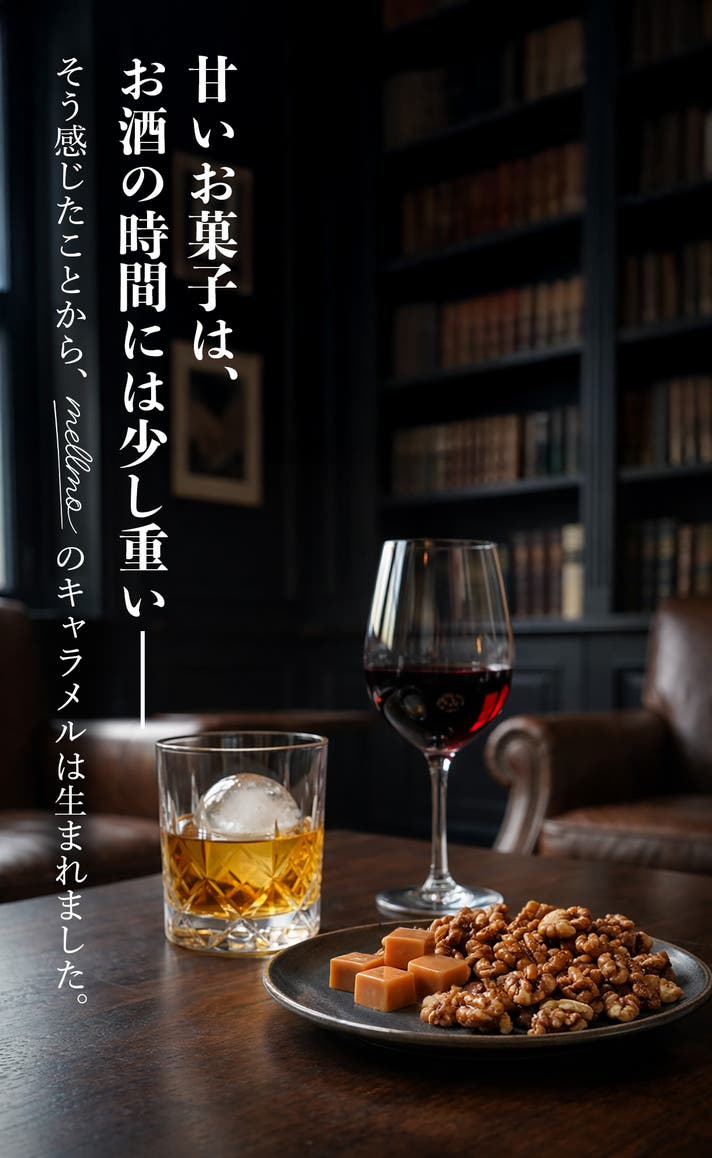 - 甘い菓子は卒業した大人へ。素材が引き立つキャラメルとナッツが、日常の夜を特別な時間に変える。