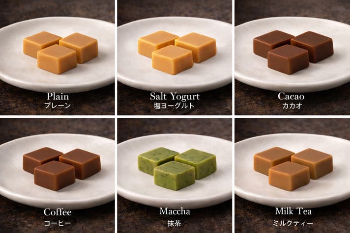 6種類のフレーバー:プレーン/塩ヨーグルト/コーヒー/ミルクティー/抹茶/カカオ