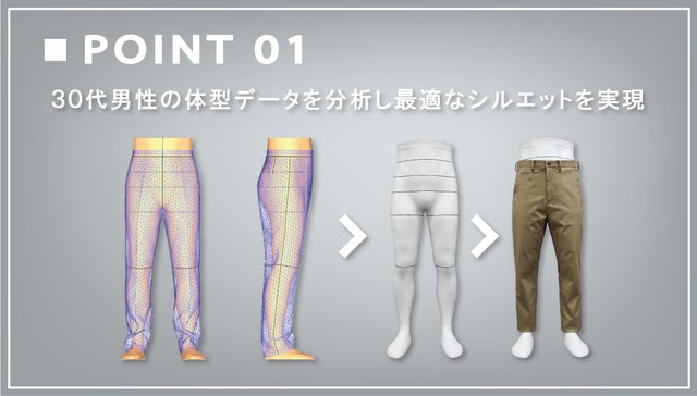 今回、メンパンは150名以上の30代男性の体型データを集積して最適なシルエットを実現しました。