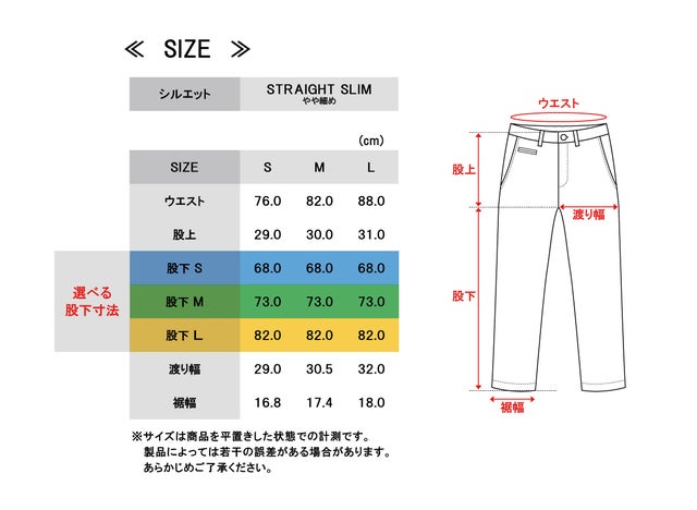 裾上げ済みになっており、そのサイズも豊富なので到着後の裾上げも不要です。