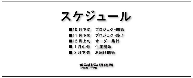 製造スケジュールについて、現在プロジェクト成功を想定した数で計画しておりますが、ご支援の数が想定を上回った場合に製造工程上の都合や配送作業に伴うやむを得ない事情により、お届けが遅れる場合がございます。 上記のようにプロジェクトページに記載している内容に変更がある場合は、できるだけ早く活動レポート等で共有致します。 また、商品不良以外の返品は不可とさせていただきますことをご了承下さい。 (モニター環境によって、画像の色が実物と異なって見える場合がございます) これからもご支援者様に喜んでいただける様、新商品の開発に挑戦し続けますので応援よろしくお願い致します。
