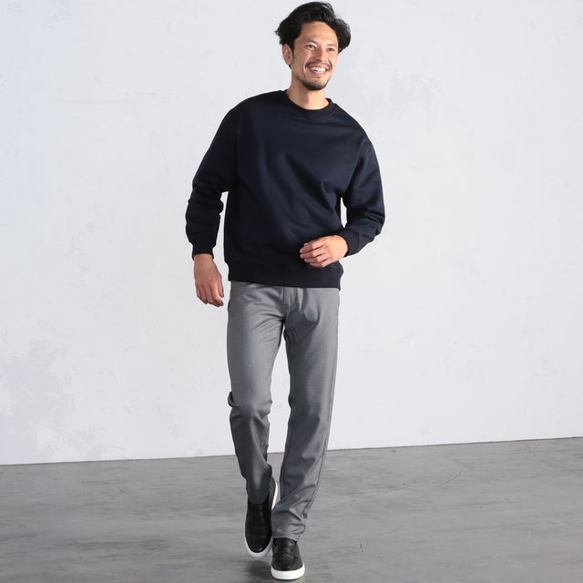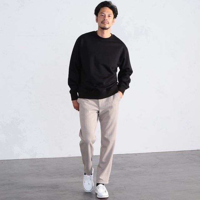 ▲イージーパンツと合わせた休日のゆったりした雰囲気のコーディネート。ゆるめのパンツですが、うっすらストライプ柄が入っているため野暮ったくならない上品なコーディネートに。重たくなりがちなブラックのスウェットもベージュの明るいパンツと合わせればバランスの取れた大人の着こなしになります。《モデル伸長184cm 着用サイズ04(LL)》