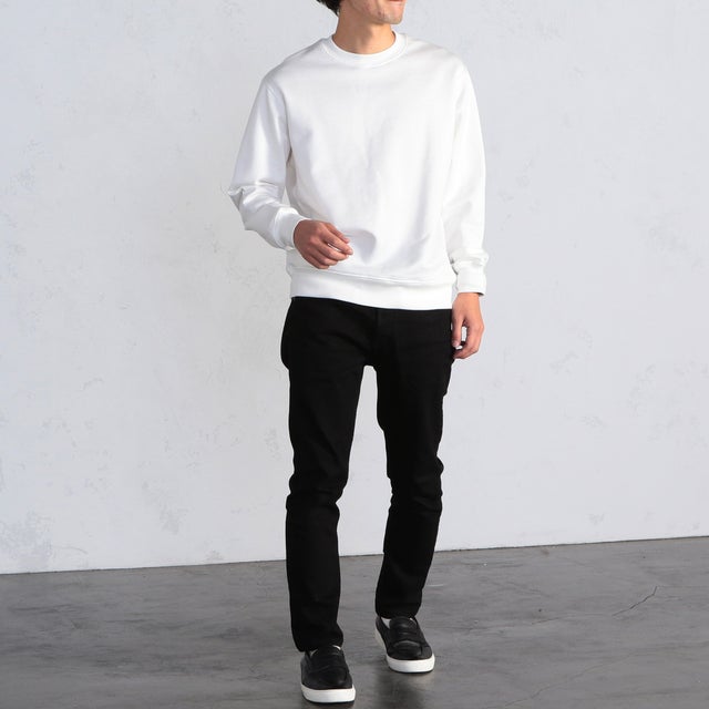 ▲ブラックデニムと合わせたシンプルなモノトーンコーデ。トップスにボリューム感がある分、パンツはスッキリさせればバランスの良い着こなしに。パンツはブラックを選んで引き立て役を任せれば、ホワイトのスウェットが主役のコーデを着こなせます。《モデル伸長169cm 体型細み 着用サイズ01(S)》
