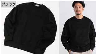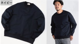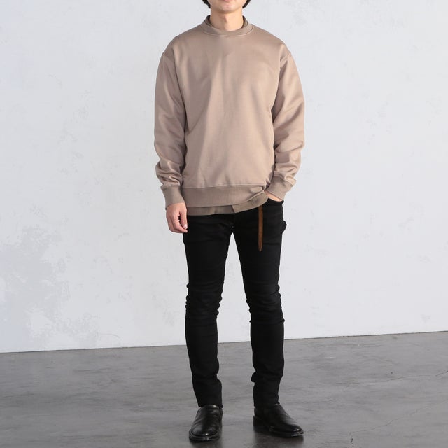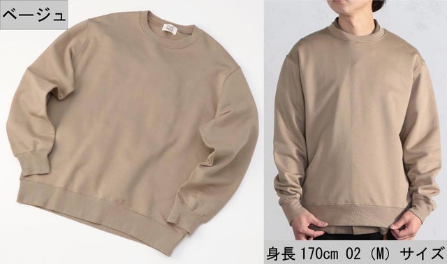 ▲スウェットの下にシャツを取り入れた大人カジュアルコーデ。オーバーサイズなので、シャツを重ねてもごわつかず、すっきり着こなすことができます。スウェット単体で着用すると「スウェットのカジュアルな印象が強すぎて実は困っている」という人にはお勧めのコーディネートです。《モデル伸長170cm 体型普通 着用サイズ02(M)》
