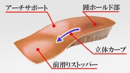 ③前滑りストッパーと立体カーブで、靴の中で足が前に滑るつんのめり感を軽減します。