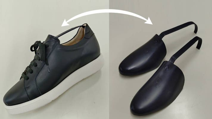 型崩れを防止するため、簡易型のシューキーパーで商品をお届けいたします。またシューズ型を整えて収納いただけます。