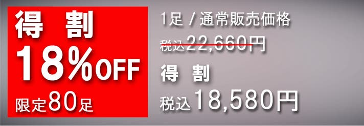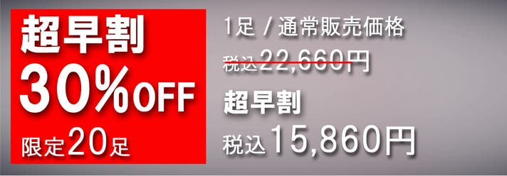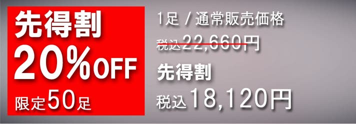 (内訳)通常販売予定価格<本体>1足(税込)21,780円+送料(税込)880円=合計22,660円の20%OFF